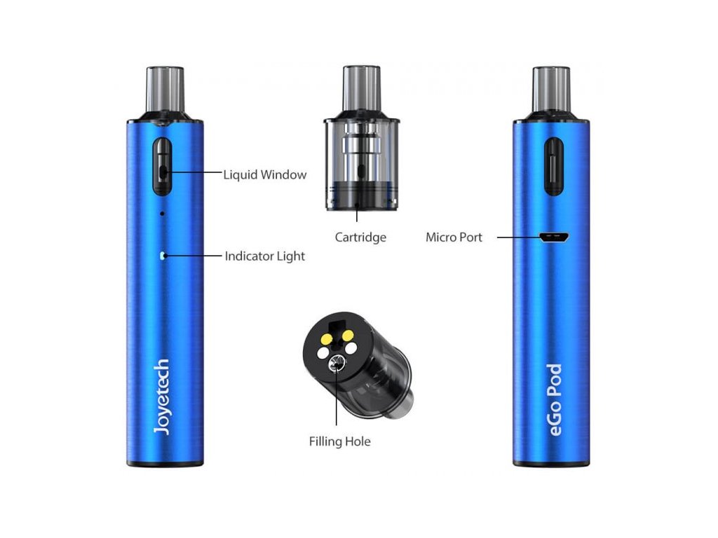 Joyetech eGo Pod je jednoduchá elektronická cigareta s POD systémem. Moderní a designové tělo e-cigarety skrývá vestavěnou baterii o kapacitě 1000mAh s automatickým spínačem a konstantním napětím 3,7V. Nový čip AVATAR IC 1.0 disponuje ochranou proti zkratu, přehřátí a vybití či 8 vteřinovou ochranu žhavení. Vyměnitelná cartridge (POD) se žhavicí hlavou o odporu 1,2ohm pojme až 2ml liquidu. Nabíjení umožňuje micro USB vstup. Tato inovace je vhodná pro kouření ve stylu MTL, tedy klasického šlukování pusa-plíce.